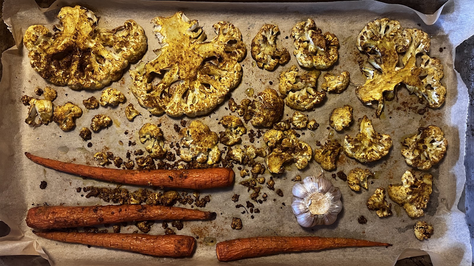 Roast your veg ahead of time, I usually do. Toss your cauli and carrots lightly in oil and spice mix of choice from above for 40 min until soft. 425˚F